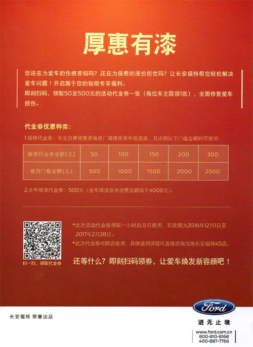 即刻掃碼,領取50至500元的活動代金券一張(每位車主限領1張),全面修復愛車損傷。