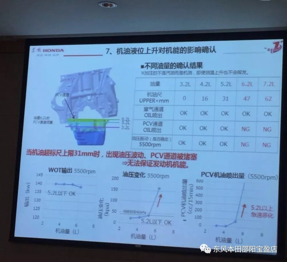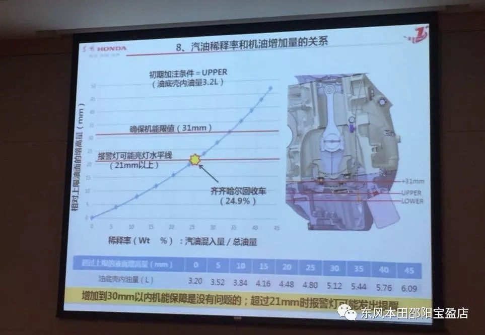 報告中稱,當機油超標尺上限31mm時,出現(xiàn)油壓波動、PCV通道被堵塞,無法保證發(fā)動機技能。從汽油稀釋率和機油增加量的關(guān)系來看,而增加到30mm以內(nèi)機能保障是沒有問題的,超過21mm時報警燈可能發(fā)出提醒。