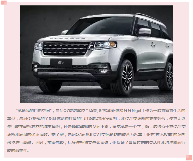 憑借全能又多變的產品力優(yōu)勢,昌河Q7不僅能夠滿足時下消費者注重的個性化需求,又能完美兼顧不同生活場景的應用,用其全適應、全場景的定位拓展了人們對于SUV認知的邊界,展示了SUV車型未來的發(fā)展風向,那就是人、車、生活的完美統(tǒng)一和無縫結合?!熬瓦m我的”Q7,就是我的生活,這就是昌河Q7想要帶給互聯(lián)網時代下年輕一代的未來移動生活方式。