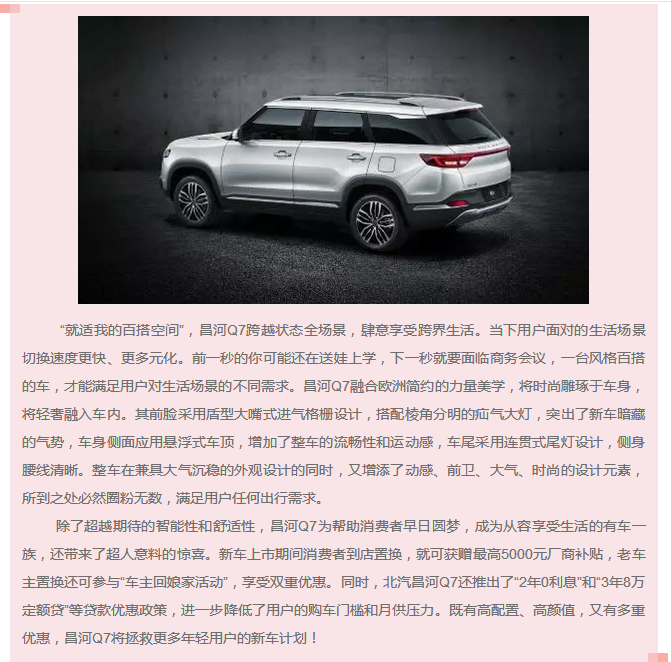 面對時代變革的新趨勢,昌河汽車以用戶需求為原點,以移動出行辦公需求和移動出行娛樂需求為突破點,打造出了一系列重點車型。昌河汽車“敢創(chuàng)同行”戰(zhàn)略發(fā)布會同步上市全新車型——北汽昌河Q7,是其2018年新戰(zhàn)略方向下的重磅戰(zhàn)略車型。