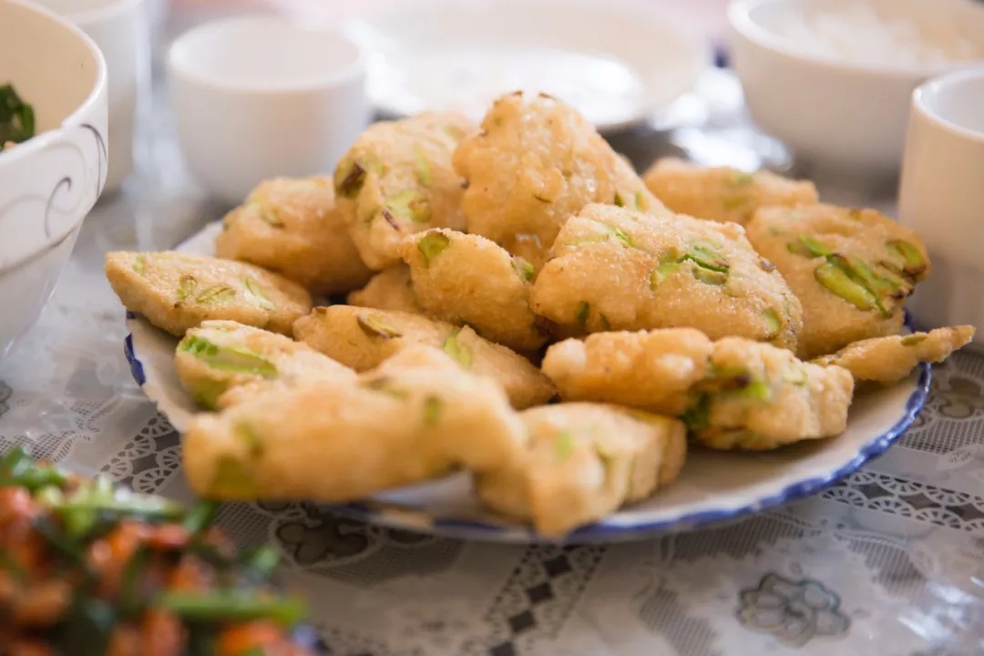 還有一道菜是我特別喜歡的,問向?qū)Т蟾缢牟嗣鞘裁?,答曰:“蠶豆包包”,是當(dāng)?shù)厝说慕蟹?,模樣長得乖巧,名字也這么可愛呢。它更像是一道餐后小甜點(diǎn),軟軟的糯米包裹著酥松的蠶豆入鍋炸,外酥里嫩,吃的時候蘸少許白糖,口感極佳。