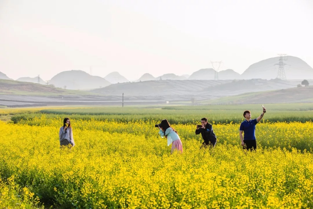 吃過午飯,我們繼續(xù)趕路。經(jīng)過三個小時的疾馳,終于見到了心心念念的那一抹金黃,羅平油菜花田,我們來啦!