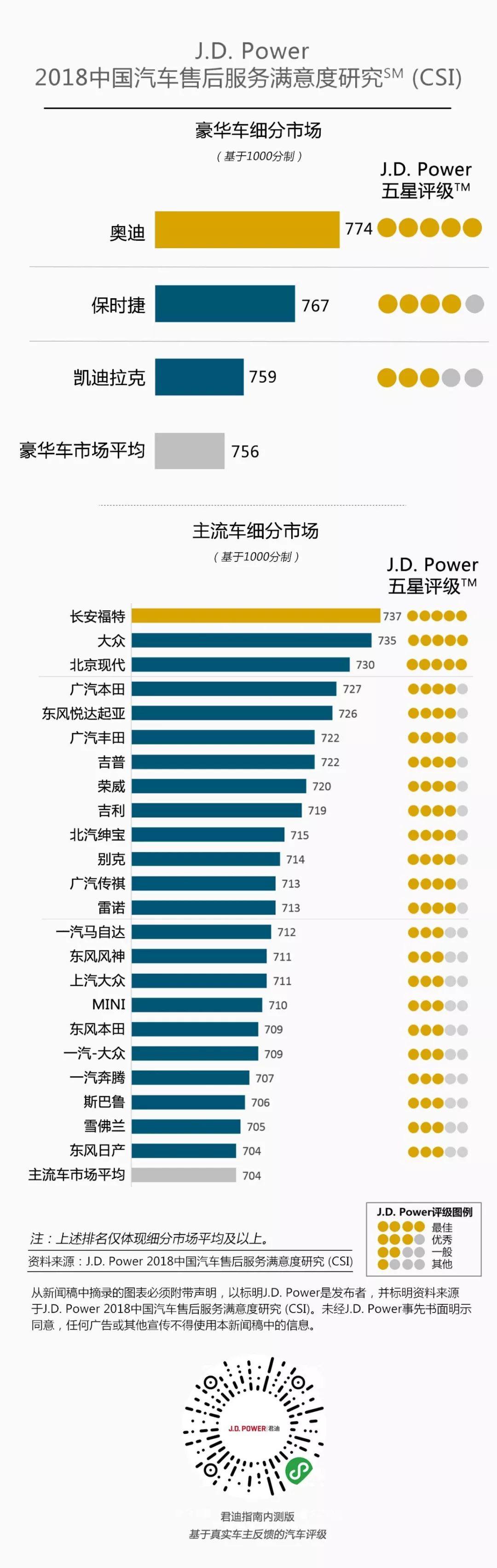 行業(yè)總體汽車售后服務(wù)滿意度微增長(zhǎng)。今年的行業(yè)總體得分(710分)僅比去年高2分。豪華車細(xì)分市場(chǎng)的提升幅度(+4分)略高于主流車細(xì)分市場(chǎng)(+1分)。自主品牌(688分)與去年持平。