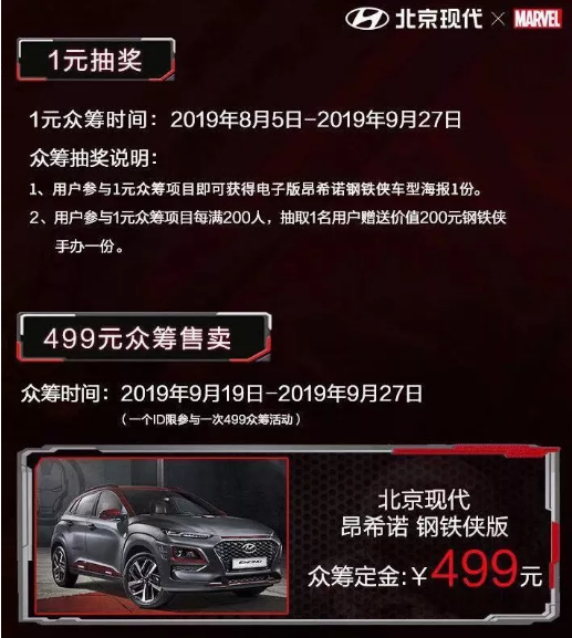 作為專為年輕人打造的個(gè)性座駕,北京現(xiàn)代以貼合年輕人喜好的形式,通過與阿里巴巴進(jìn)行深度跨界品牌合作,在阿里魚眾籌平臺(tái)-“造點(diǎn)新貨”限量上線首批499臺(tái)昂希諾 鋼鐵俠版,以499元的預(yù)定金,發(fā)起為期9天、限量499臺(tái)的眾籌活動(dòng),為年輕消費(fèi)者提供了全新的購(gòu)車體驗(yàn)。此外,針對(duì)購(gòu)買昂希諾 鋼鐵俠版的用戶,北京現(xiàn)代還將提供分期3年免息金融政策,為更多年輕用戶降低購(gòu)買門檻。