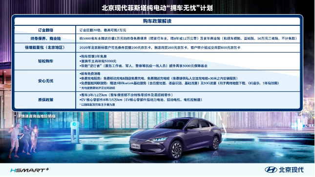 2020年3月10日,北京現(xiàn)代舉行菲斯塔純電動——純電時尚魅力座駕線上發(fā)布會,現(xiàn)場公布國補(bǔ)后售價為17.38-19.88萬元,并推出“擁車無憂”的購車政策。消費(fèi)者購買菲斯塔純電動可在國補(bǔ)后售價的基礎(chǔ)上再享受3萬元的高額購車禮遇,以及3年免息、超值置換補(bǔ)貼等多重福利。
