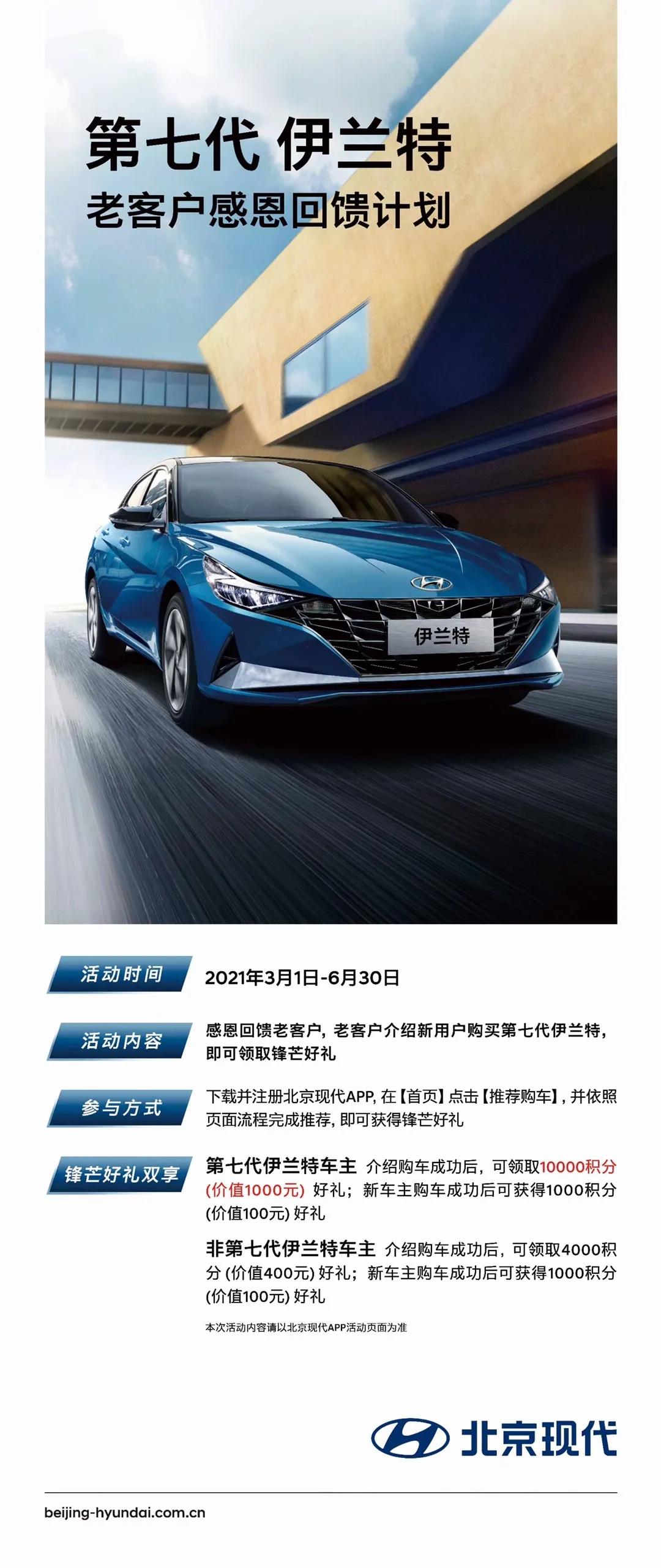 尊敬的第七代伊蘭特車主,您好!為回饋廣大客戶的長(zhǎng)期支持,現(xiàn)推出“第七代伊蘭特老客戶感恩回饋計(jì)劃”,通過北京現(xiàn)代 APP 推薦好友成功購(gòu)買第七代伊蘭特(第七代伊蘭特車主)推薦可得 10000 積分(價(jià)值 1000 元)被推薦人可得 1000 積分(價(jià)值 100 元)