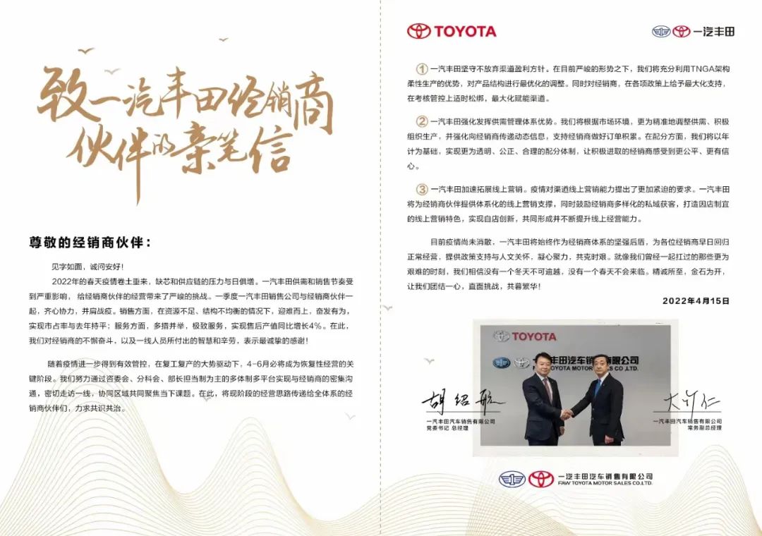 日前,一汽豐田銷售公司黨委書記、總經(jīng)理胡紹航給經(jīng)銷商群體發(fā)出了一份公開信,他在信中寫道:“盡管困難遠(yuǎn)超出預(yù)期,但我們相信,只要萬眾同心共克時(shí)艱,方法就總比困難多!”