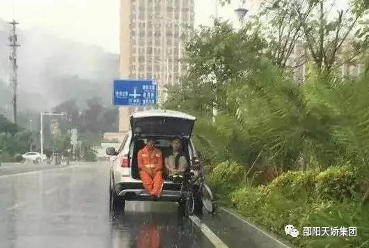 大雨中,一位好心的小伙開車路過,發(fā)現(xiàn)環(huán)衛(wèi)工人沒有地方躲雨,就主動邀請雨中的環(huán)衛(wèi)工人上車避雨。環(huán)衛(wèi)工人怕自己弄臟車子,不肯答應,后來小伙子就和他一起在后備箱里避雨。