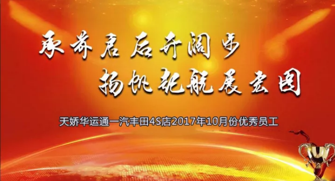 銀色的十月已過去,輝煌的十一月悄然來臨,時(shí)間晃晃而過已是2017年11月11日,天嬌華運(yùn)通一汽豐田4S店每月一次的總結(jié)優(yōu)秀員工表彰大會(huì)如期而至。