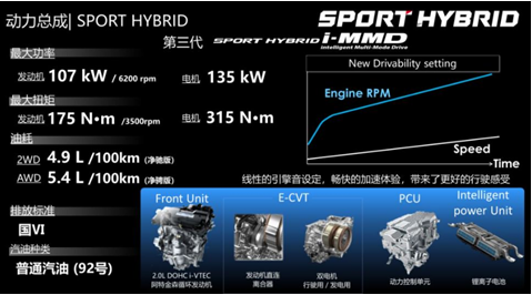 混動(dòng)版車(chē)型搭載的是本田引以為傲的第三代i-MMD混合動(dòng)力系統(tǒng),其中2.0L阿特金森循環(huán)發(fā)動(dòng)機(jī)的最大功率為107kW,最大扭矩為175N?m,電動(dòng)機(jī)的最大功率為135kW,最大扭矩為315N·m;與之匹配的是E-CVT變速箱。燃油版及銳·混動(dòng)版均有四驅(qū)系統(tǒng)可選擇。
