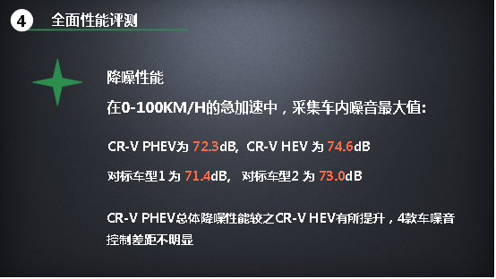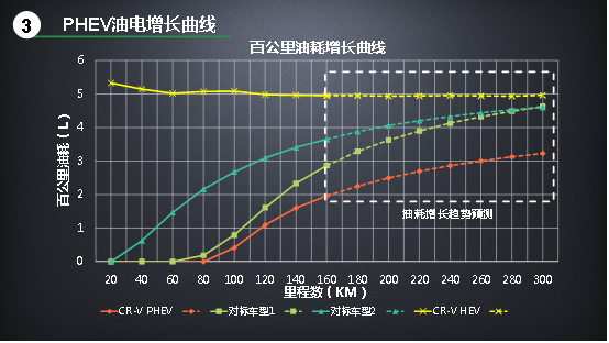 需要提示的是,這個曲線是在車輛滿電、均速22.3km/h的工況下測試獲得的,并且圖表只展示到300公里的趨勢預(yù)測,因此出現(xiàn)了三款PHEV車型的油耗均低于CR-V銳·混動的情況。伴隨著里程的進一步延長,或者直接以低電量工況測試,對標(biāo)車型1和對標(biāo)車型2的油耗數(shù)據(jù)會持續(xù)增長并超過CR-V銳·混動的油耗(其中對標(biāo)車型1會達到7.1L左右,對標(biāo)車型二會達到5.7L左右),而CV-R銳·混動e+的峰值則只會與CR-V銳·混動接近(4.9L左右)。