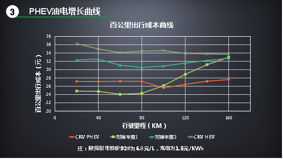 最后一個,也是更直觀的,即百公里出行成本曲線——它直接對應(yīng)到你花的“錢”。圖表看上去復(fù)雜,其實也很直觀:橫軸對應(yīng)多少公里,縱軸找到出行成本的金額即可。那么很清晰,100公里及以上,CR-V銳·混動e+的成本是最低的。