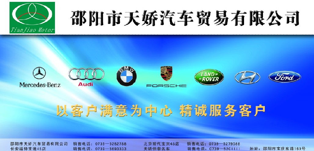 經(jīng)湖南省邵陽市人民政府批準(zhǔn),邵陽市第四屆汽車博覽會定于2011年9月23日至9月25日在邵陽市魏源廣場隆重舉行。本次車展由邵陽電視臺主辦、邵陽市汽車行業(yè)商會、邵陽市交警協(xié)辦,30余家汽車經(jīng)銷商共同參與的一次盛大的汽車博覽會,天嬌集團(tuán)旗下的寶迪4s店,寶京4s店,恒泰名車店經(jīng)營有奧迪、奔馳、寶馬、保時捷、路虎、現(xiàn)代、福特,屆時恭迎您的大駕光臨。