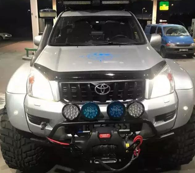 先來(lái)看看它的前臉,這輛普拉多應(yīng)該是一輛低配的版本,連霧燈也沒(méi)有,所以車主改裝了一排4盞LED大燈在加裝的簡(jiǎn)易防撞杠上,而進(jìn)氣口為了不受水淹的影響,從翼子板開(kāi)孔延長(zhǎng)至A柱上。