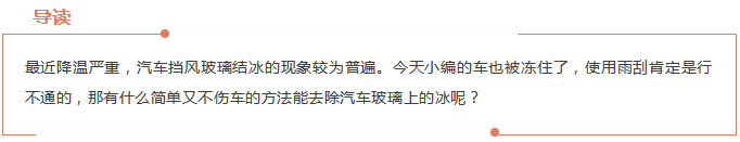 目前市場(chǎng)上有一種噴霧除冰雪劑,它是專(zhuān)為結(jié)冰的車(chē)窗和雨刮器解凍的高速防冰噴灑濃縮液,不損傷車(chē)身表面,可防止再次結(jié)冰和弄臟。在零下30℃以下的低溫時(shí),可輕易地除去冰雪,同時(shí),它還能防止擋風(fēng)玻璃和積水部位結(jié)冰,不損傷車(chē)身表面,清理后玻璃光潔,不留痕跡。