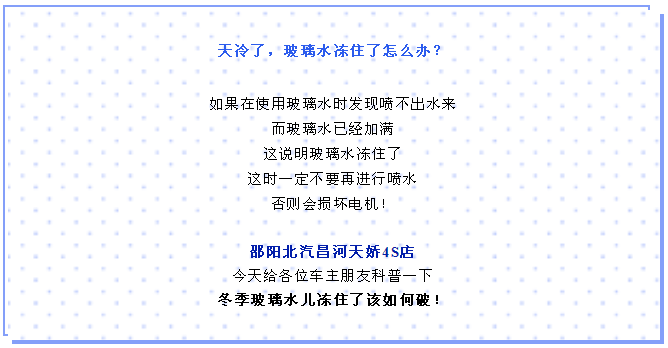 如果太陽(yáng)曬不開(kāi),也可以在玻璃水水箱中加一些溫水(不可以加開(kāi)水),待化開(kāi)玻璃水后,盡快將水排出,以免再次凍住,然后加入冬季專用玻璃水。