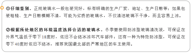 如果前面2種方法都不管用,也可嘗試先開(kāi)車上路,等發(fā)動(dòng)機(jī)水溫升高以后,玻璃水自然會(huì)化開(kāi),這時(shí)再將水箱里的玻璃水完全排出,加入冬季專用玻璃水。