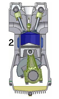 由火花塞點燃混合氣,釋放能量帶動活塞運動。